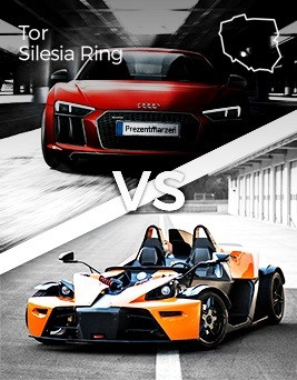 Przejażdżka za kierownicą Audi R8 V8 i KTM X-BOW na torze Silesia Ring to pojedynek sportowych supersamochodów, który dostarczy niezapomnianych emocji i wrażeń. Możliwość poprowadzenia dwóch sportowych samochodów na profesjonalnym torze wyścigowym to niecodzienne doświadczenie, które rozwinie motoryzacyjną pasję. Atrakcja realizowana jest w dniu eventu motoryzacyjnego, na którym pojawi się kilkanaście innych supersamochodów, którym będzie można się przyjrzeć po odbytym pojedynku. Jazda Audi R8 i KTM X-BOW w roli kierowcy na torze Silesia Ring odbywa się w towarzystwie instruktora.